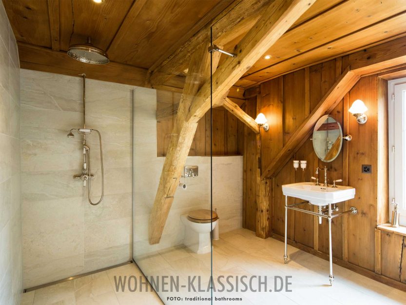 In diesem rustikalen Gebälkambiente sorgen traditionelle Badelemente von Traditional Bathrooms wie das Waschbecken „Bristol“ mit stehender Metallkonsole für eleganten Glanz. Für ausgedehntes Duschvergnügen wurde eine XXL-Kopfbrause mit einer geräumigen bodenebenen Duschfläche kombiniert.